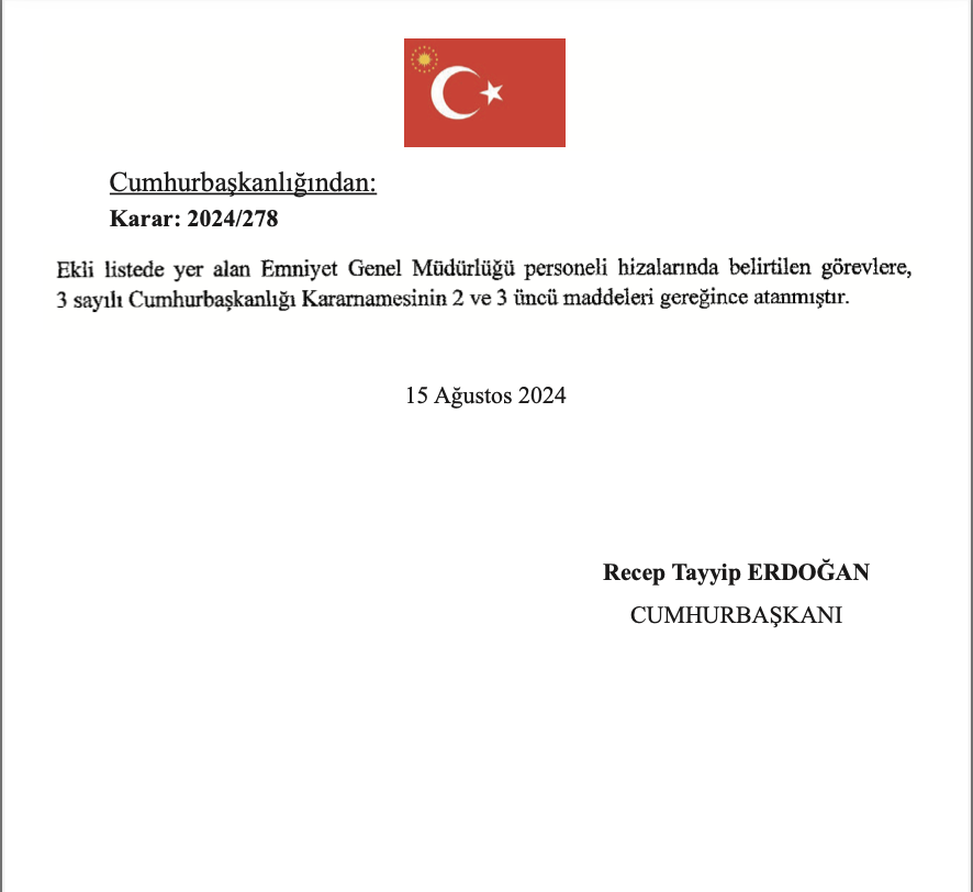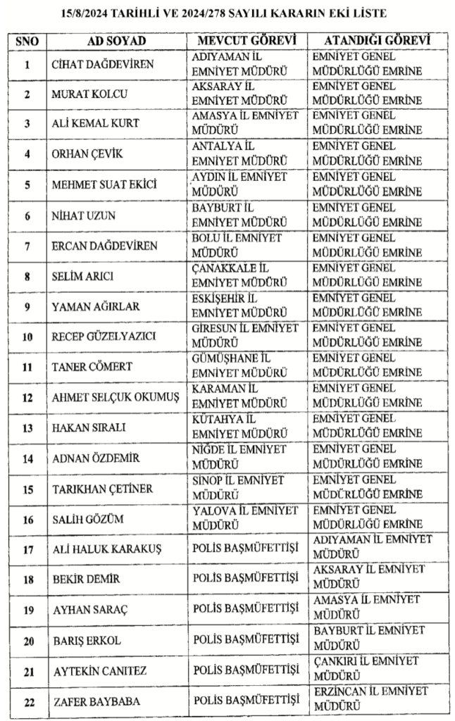 Cumhurbaşkanı Erdoğan tarafından imzalanan kararname ile Türkiye genelinde 23 ilin emniyet müdürlüklerinde önemli değişiklikler yapıldı. Emniyet Genel Müdürü Erol Ayyıldız’ın Bursa Valisi olarak atanmasıyla birlikte yerine Mahmut Demirtaş getirildi. Jandarma Genel Komutanı Orgeneral Arif Çetin ise yaş haddi nedeniyle emekliye ayrılarak, yerine Orgeneral Ali Çardakcı atandı.