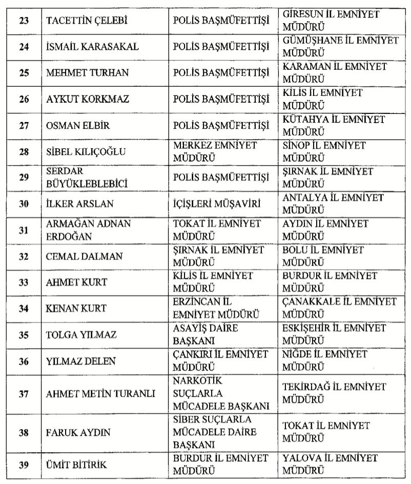 Diğer atamalar şu şekilde gerçekleşti: Tokat Emniyet Müdürü Armağan Adnan Erdoğan, Aydın Emniyet Müdürlüğüne; Şırnak Emniyet Müdürü Cemal Dalman, Bolu Emniyet Müdürlüğüne; Kilis Emniyet Müdürü Ahmet Kurt, Burdur Emniyet Müdürlüğüne; Erzincan Emniyet Müdürü Kenan Kurt, Çanakkale Emniyet Müdürlüğüne; Çankırı Emniyet Müdürü Yılmaz Delen, Niğde Emniyet Müdürlüğüne atandı.