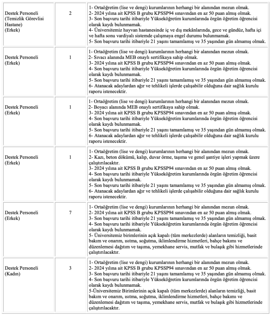 - Destek Personeli (şoför, temizlik, boyacı, sıvacı vb. toplam 15 kişi): Lise mezunu, ilgili sertifikalara sahip olma, KPSSP94’ten en az 50 puan ve 35 yaş altı şartı aranıyor.
