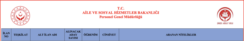 Aile Bakanlığı güvenlik görevlisi alımı başvuruları 15/12/2025 – 26/12/2025 tarihleri arasında son gün saat 23:59’a kadar Cumhurbaşkanlığı Kariyer Kapısı (https://kariyerkapisi.gov.tr/isealim) üzerinden e-Devlet şifresi ile giriş yaparak gerçekleştirecek. Belirtilen süre içinde Cumhurbaşkanlığı Kariyer Kapısı üzerinden yapılmayan başvurular dikkate alınmayacaktır.