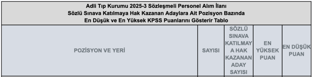 1) Adli Tıp Kurumu Merkez ve Taşra Teşkilatında 657 sayılı Devlet Memurları Kanunu’nun 4/B maddesi uyarınca istihdam edilmek üzere, 20 Ekim 2025 tarihinde yayımlanan Adli Tıp Kurumu 2025-3 sözleşmeli personel alım ilanımıza 23 Ekim – 05 Kasım 2025 tarihleri arasında Cumhurbaşkanlığı Kariyer Kapısı üzerinden yapılan başvurular Başkanlığımızca incelenmiştir.
