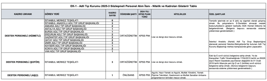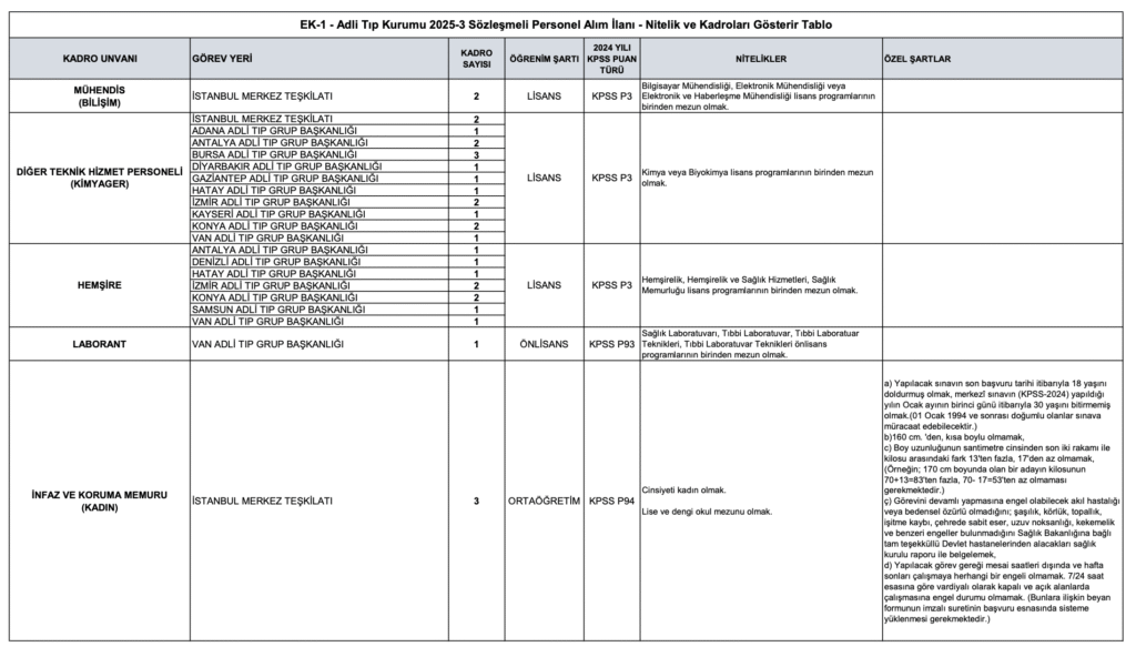 Adli Tıp Kurumu (ATK), merkez ve taşra teşkilatlarında görevlendirmek üzere 85 sözleşmeli personel alımı yapacağını duyurdu. Alımlar, 657 sayılı Devlet Memurları Kanunu’nun 4/B maddesi uyarınca gerçekleştirilecek. Başvurular, 23 Ekim 2025 tarihinde başlayacak. İşte kontenjanlar ve şartlar..