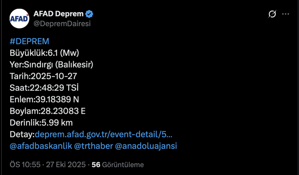 AFAD verilerine göre, 27 Ekim 2025 tarihinde Balıkesir’in Sındırgı ilçesinde saat 22:48:29’da yerin yaklaşık 6 kilometre derinliğinde 6.1 büyüklüğünde bir deprem meydana geldi. Depremin merkez üssü 39.18389 kuzey enlemi ile 28.23083 doğu boylamı olarak belirlendi.