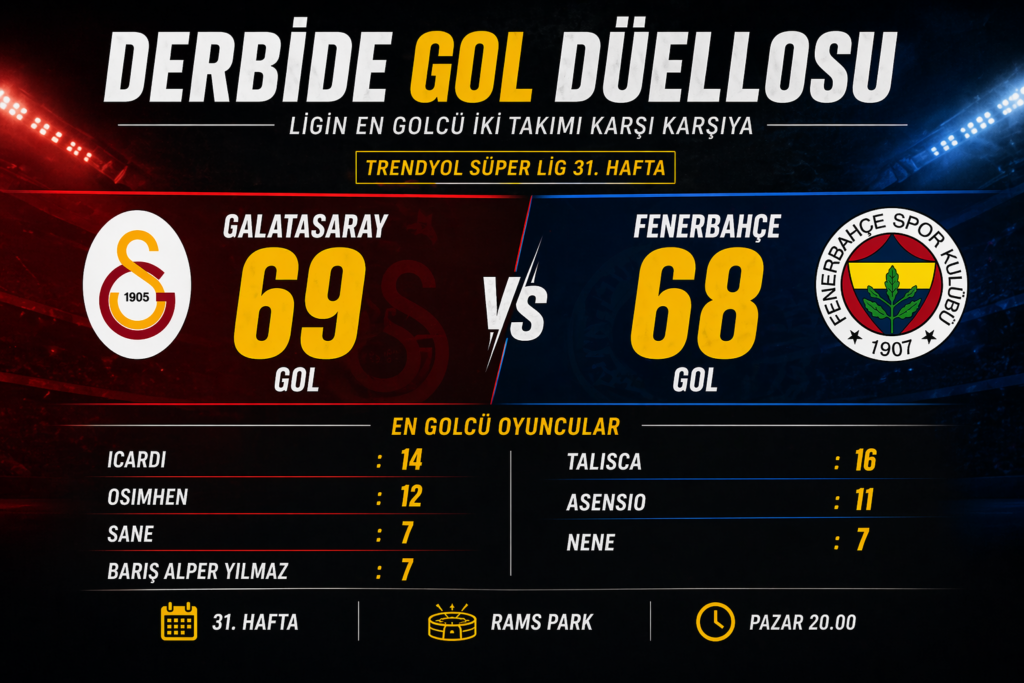 Trendyol Süper Lig’in 31. haftasında oynanacak Galatasaray – Fenerbahçe derbisi, sadece şampiyonluk yarışını değil, hücum gücü açısından da dikkat çekici bir mücadeleye sahne olacak. İki ezeli rakip, sezonun en golcü takımları olarak sahaya çıkacak.