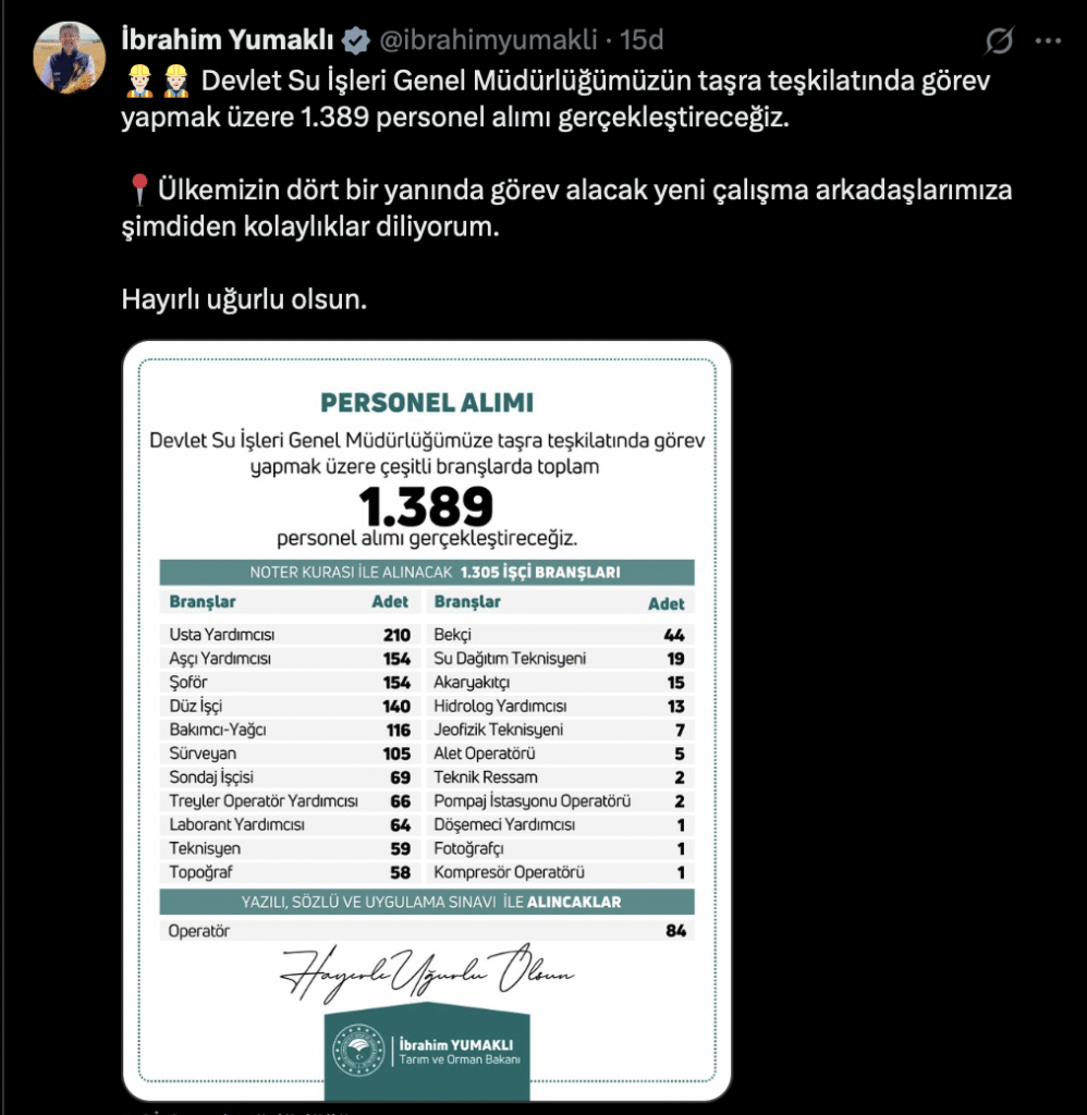 Devlet Su İşleri (DSİ) taşra teşkilatında istihdam edilmek üzere toplam 1.389 personel alımı yapacağını duyurdu. Alımların büyük çoğunluğu noter kurası ile yapılacak olup, sadece bir kadroda yazılı, sözlü ve uygulama sınavı uygulanacak.