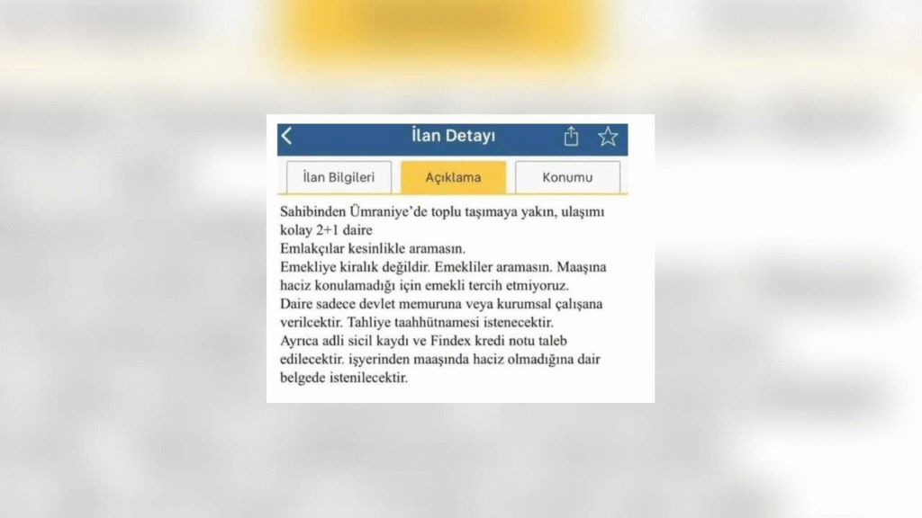 Ticaret Bakanlığı, bir ilan sitesinde yer alan ve “emekliye kiralık değildir” ifadesiyle yayımlanan konut ilanına müdahale etti. Taşınmaz Ticareti Hakkında Yönetmelik’e aykırı bulunan ilan yayından kaldırıldı, ilgili emlak ofisine ise idari para cezası kesildi.