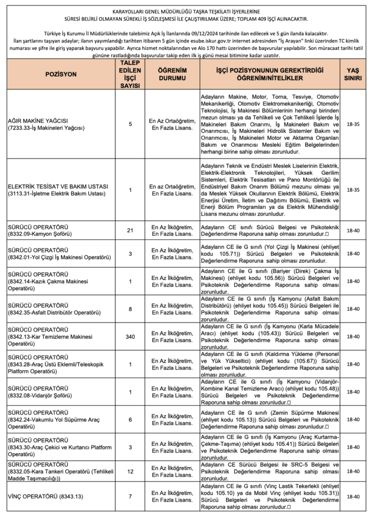 Karayolları Genel Müdürlüğü, taşra teşkilatında çalıştırmak üzere çeşitli pozisyonlarda toplam 409 işçi alımı gerçekleştireceğini duyurdu. Alım ilanı, Türkiye İş Kurumu (İŞKUR) üzerinden 9 Aralık 2024 tarihinde yayımlanacak ve başvurular 5 gün sürecek. İlgili pozisyonlar ve başvuru şartları şu şekilde: