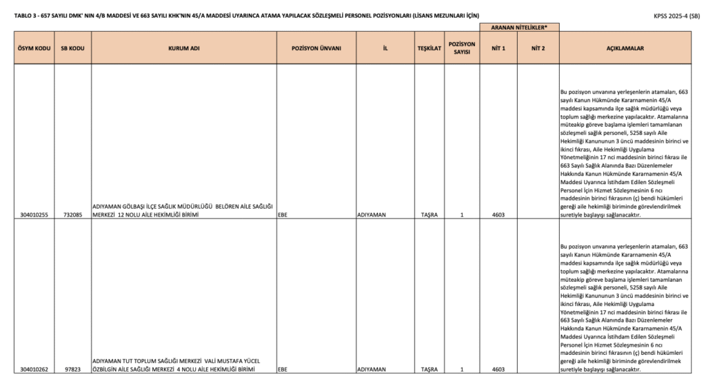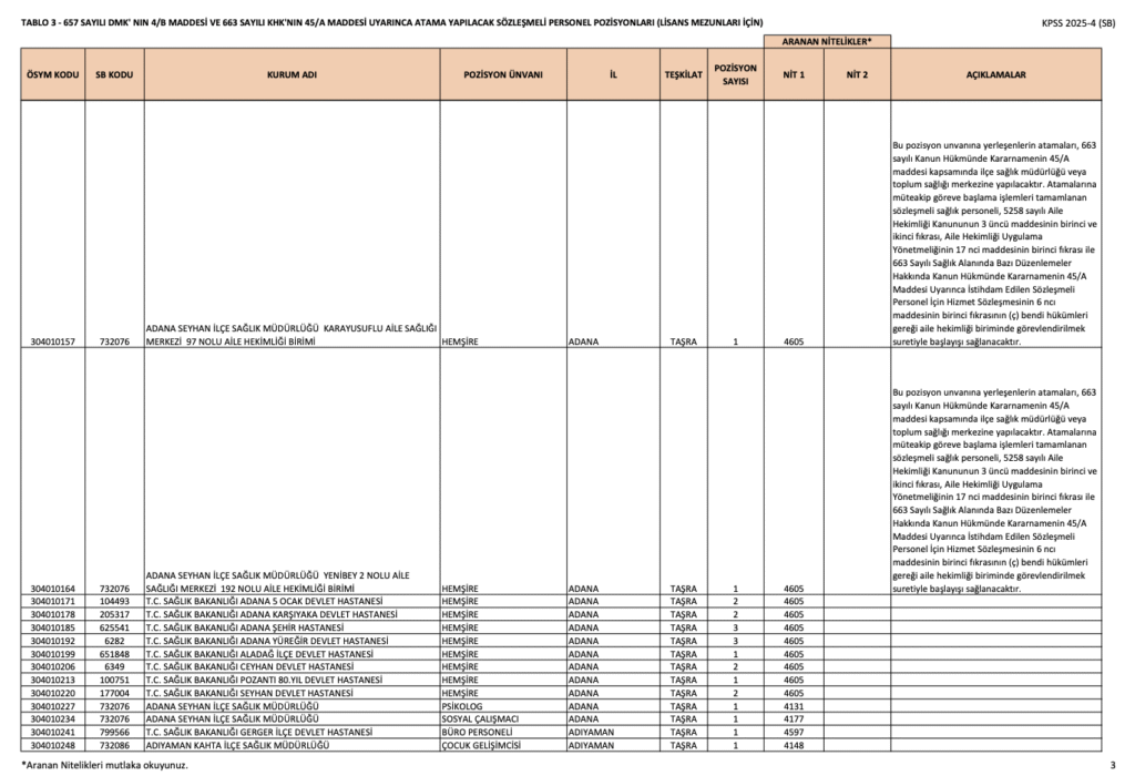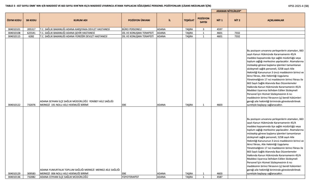 ÖSYM üzerinden yayımlanan KPSS 2025/4 tercih kılavuzunda lisans mezunlarından Biyolog, Çocuk Gelişimcisi, Dil ve Konuşma Terapisti, Diyetisyen, Ebe, Fizyoterapist, Gerontolog, Hemşire, İş ve Uğraşı Terapisti (Ergoterapist), Odyolog, Perfüzyonist, Psikolog, Sağlık Fizikçisi, Sosyal Çalışmacı ünvanlarında personel alınacağı kaydedildi. İllere göre kontenjan dağılımı ve diğer detaylar aşağıdaki gibidir.