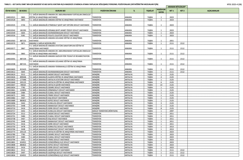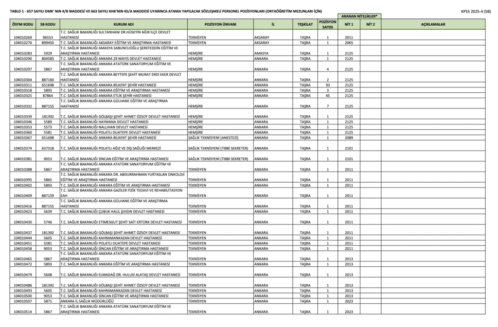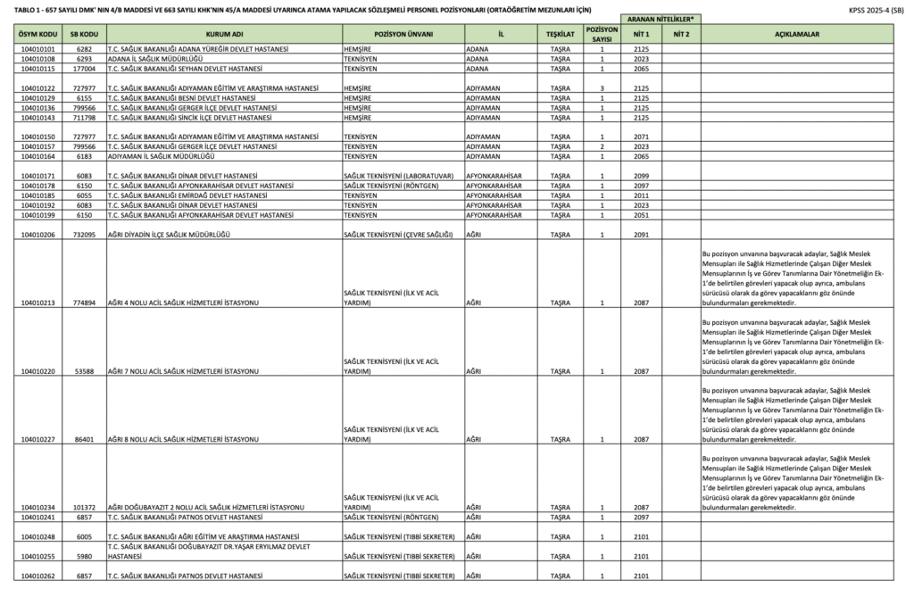 ÖSYM sayfasından yayımlanan KPSS 2025/4 kılavuzuna göre ortaöğretim mezunu adaylar, Destek Personeli (Şoför), Hemşire, Sağlık Teknisyeni (Anestezi), Sağlık Teknisyeni (Çevre Sağlığı), Sağlık Teknisyeni (İlk ve Acil Yardım), Sağlık Teknisyeni (Laboratuvar), Sağlık Teknisyeni (Röntgen), Sağlık Teknisyeni (Tıbbi Sekreter), Teknisyen pozisyonu için tercihlerini 2 Mayıs – 8 Mayıs 2025 tarihleri arasında gerçekleştirecek. Tercih işlemleri ÖSYM’nin http://ais.osym.gov.tr/ adresi üzerinden yapılacak.
