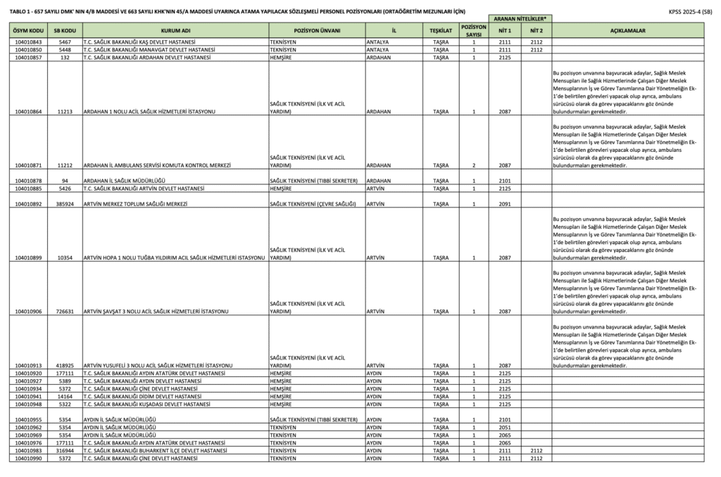 KPSS 2025/4 Ortaöğretim Kontenjanları.