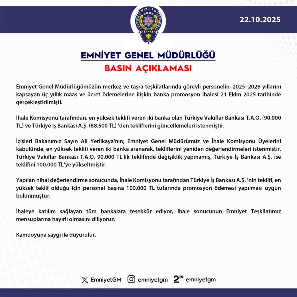 Emniyet Genel Müdürlüğü bünyesindeki merkez ve taşra teşkilatlarında görev yapan personelin 2025-2028 yılları arasındaki maaş ve ücret ödemelerine ilişkin banka promosyon ihalesi 21 Ekim 2025 tarihinde gerçekleştirildi. İhale sürecine Türkiye Vakıflar Bankası T.A.O. ve Türkiye İş Bankası A.Ş. katıldı.