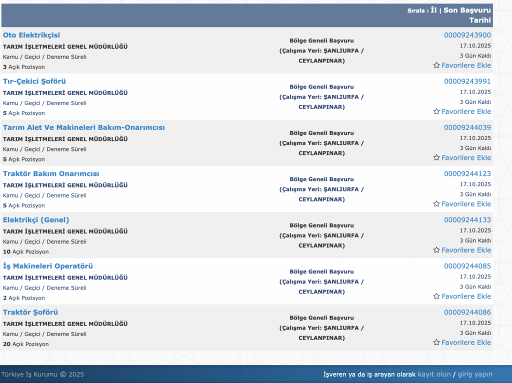 Tarım ve Orman Bakanlığı’na bağlı Tarım İşletmeleri Genel Müdürlüğü (TİGEM), Ceylanpınar Tarım İşletmesi’nde görevlendirilmek üzere 50 geçici mevsimlik işçi alımı başvuruları başladı. Alım, İŞKUR üzerinden 18 Ekim 2025 tarihine kadar elektronik ortamda yapılacak.İşte şartlar ve başvuru bilgileri…